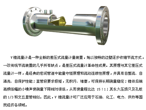 V錐流量計是一種全新的差壓式流量計量裝置,并以******的邊壁逐步收縮節流方式,一改傳統節流的幾乎所以缺點,是差壓式流量計革命性成果,因此V錐流量計可廣泛用于石油,化工,電力,熱供等國民經濟各領域